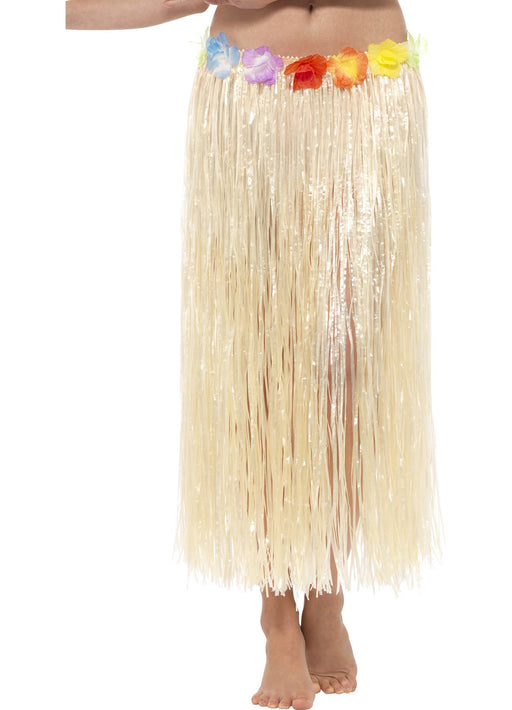 Hawaiian themed natural look grass skirt with attached flower waist band and elasticated waist.