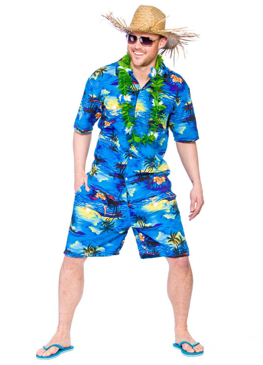 This blue patterned shirt and shorts set would be ideal for a Summer time beach or Hawaiian themed party. Comes in 4 different sizes. Green lei an...
