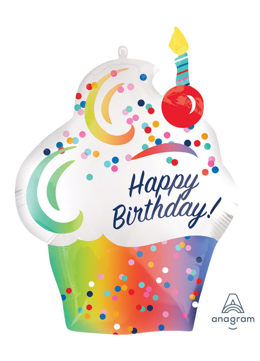 Ombre Happy Birthday cupcake rainbow design large balloon measuring 68 cm x 50 cm (27 in x 20 in) when inflated. Click & Collect orders: Ball...