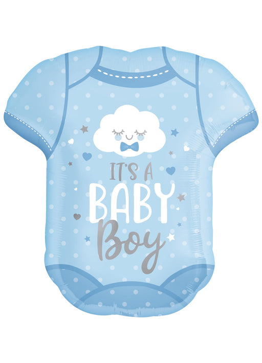 It's a baby boy blue onesie super shape foil balloon measuring 55 cm x 60 cm (22" x 24") when inflated. Click & Collect orders: Balloon suppl...
