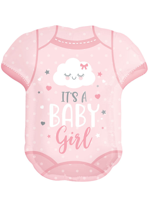 It's a baby girl pink onesie super shape foil balloon measuring 55 cm x 60 cm (22" x 24") when inflated. Click & Collect orders: Balloon supp...