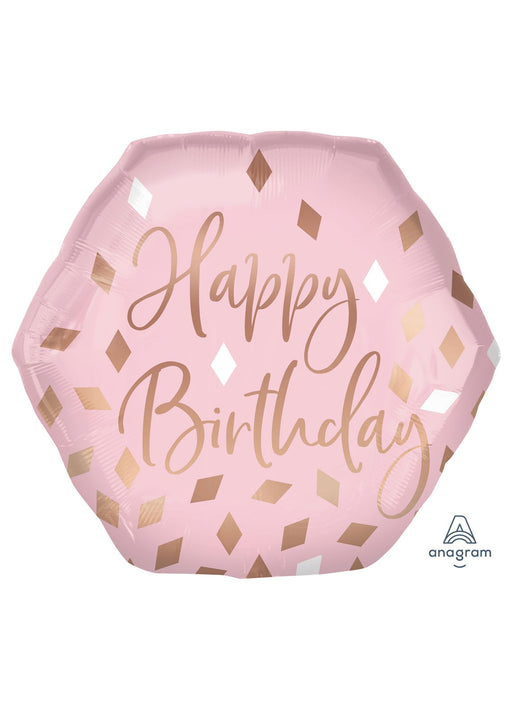 Rose gold & pink blush large hexagon shaped Happy Birthday foil balloon measuring 58 cm x 55 cm (23" x 22") when inflated. Click & Collec...