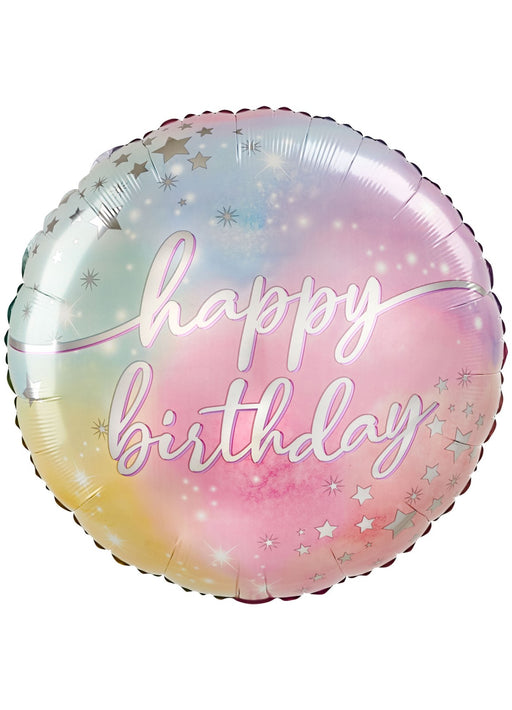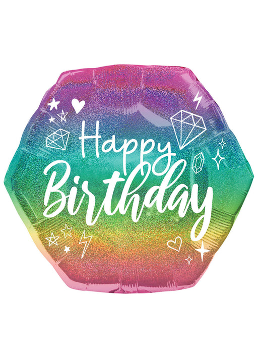 Large holographic hexagon shaped Happy Birthday balloon measuring 58 cm (23 in) across when inflated.