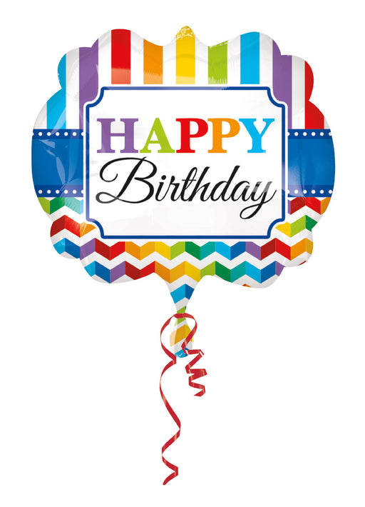 Happy birthday super shape foil balloon on coloured stripes and chevrons background measuring 25" x 22". Click & Collect orders: Balloon supp...