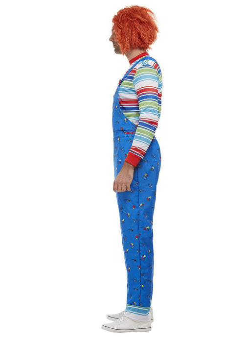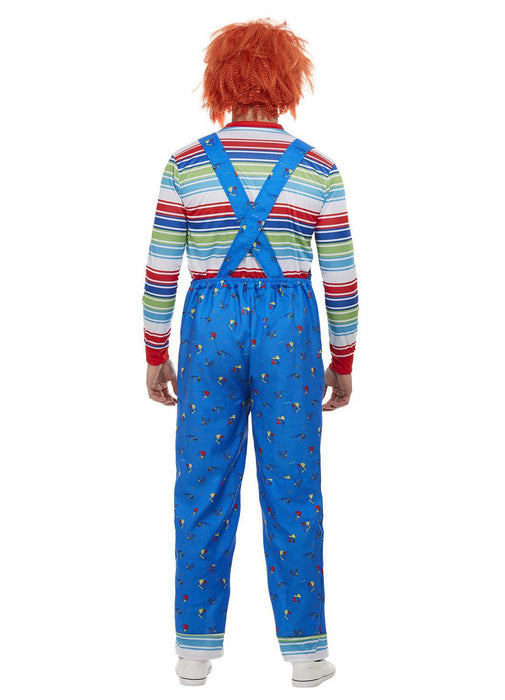 Official licensed adult horror Halloween Chucky costume which includes stripped top and pair of blue dungarees with red buttons. Add some make-up and Chucky wig or mask to get the complete scary look!