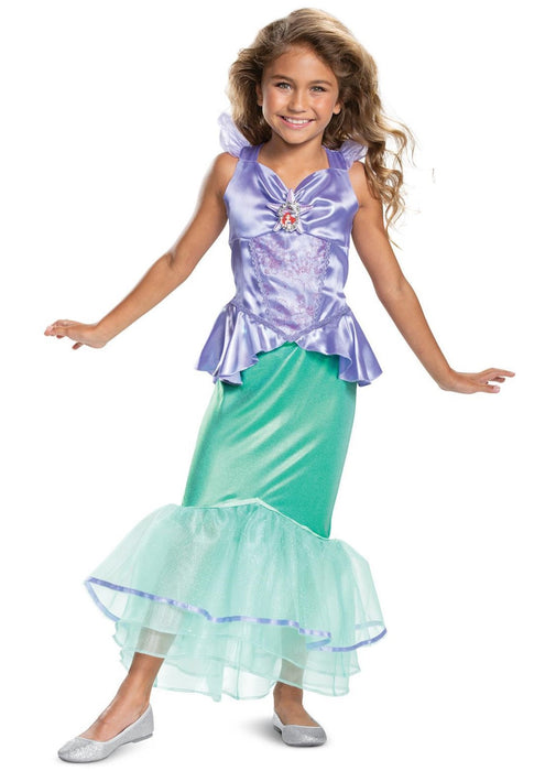 Licensed Disney Princess deluxe Little Mermaid Ariel character fancy dress costume consisting of long layered dress with character cameo.