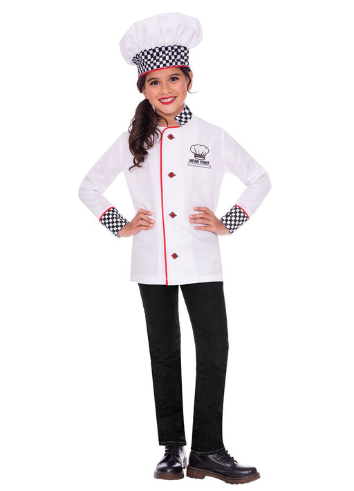 Children's unisex chef fancy dress costume with character jacket and puff hat.