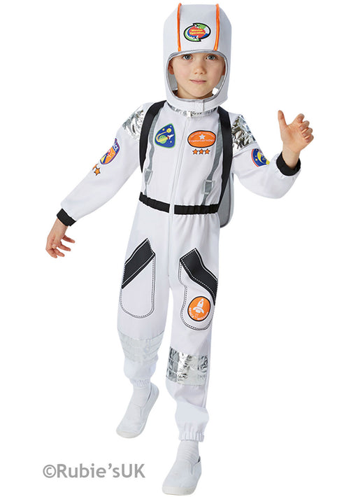 Space Astronaut fancy dress costume consisting of white jumpsuit with printed logos and black cuffs, matching headpiece with velcro fastening &...