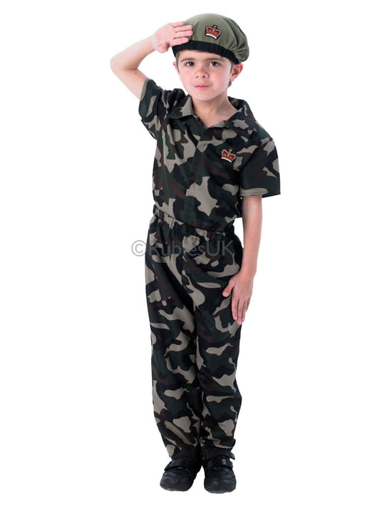 Child's soldier boy costume consisting of camouflage printed top and matching trousers with elasticated waist. Also included is the green beret. ...