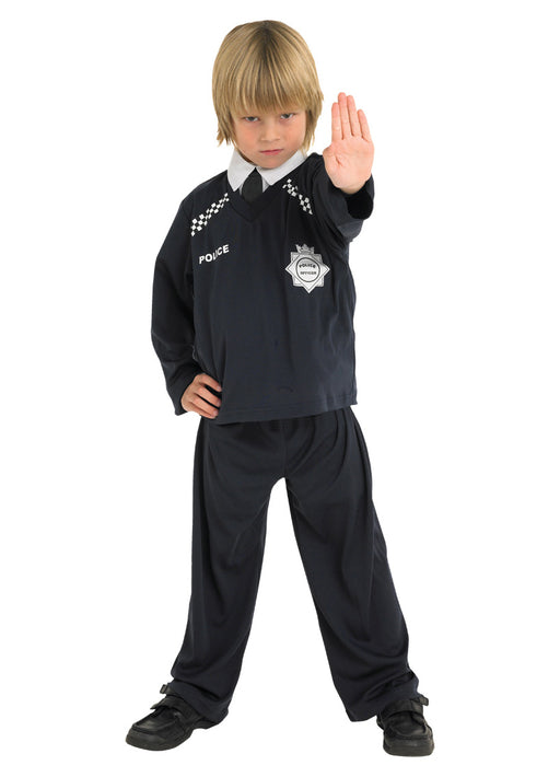 This child's police costume includes dark blue elasticated trousers and printed top with faux shirt and collar. Size Age Height Medium 5-6 y...