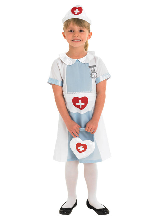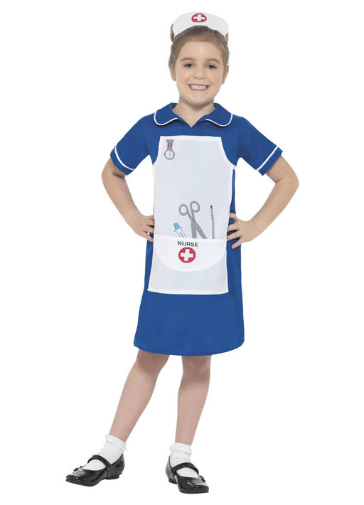Girl's nurse fancy dress outfit with royal blue dress with printed front and pouch along with headpiece. Size Age Height Small 4-6 years 115-...