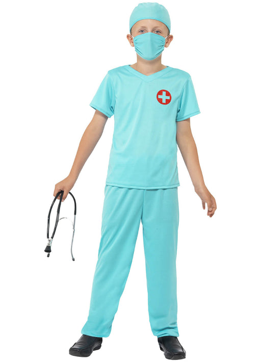 Child's surgeon costume consisting of blue top with red cross logo, elasticated blue trousers, stethoscope, matching hat and face mask to complete ...