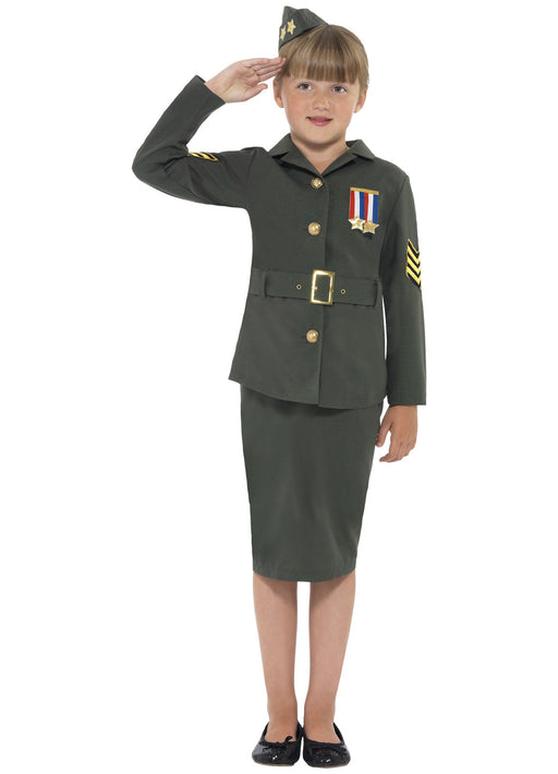 World War 2 themed Army girl costume consisting of dark green jacket with attached belt, gold buttons and army medals for decoration, matching elas...