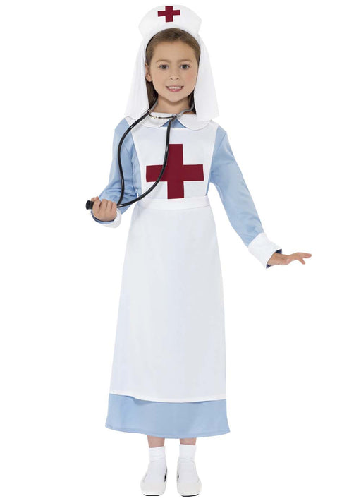 WW1 based Nurses costume consists of long blue dress with white cuffs and collar, white mock apron with red cross design and matching headpiece. Ad...