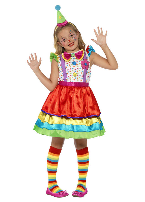 Multi-coloured deluxe clown girl costume with layered dress with attached bow tie and headband hat. Please note stockings not included. Size Ag...