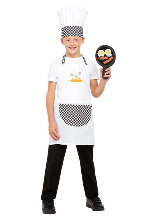 Children's cook costume kit consisting of apron, white chef hat and bacon and eggs EVA prop frying pan. Size Age Height Small 4-6 years 115-12...