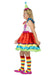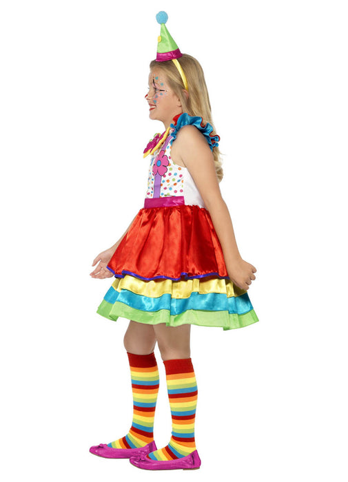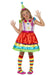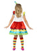 Multi-coloured deluxe clown girl costume with layered dress with attached bow tie and headband hat. Please note stockings not included.