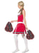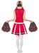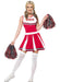 Cheerleader costume consisting of red and white dress with printed design & a pair of red, white and black pom poms.