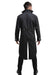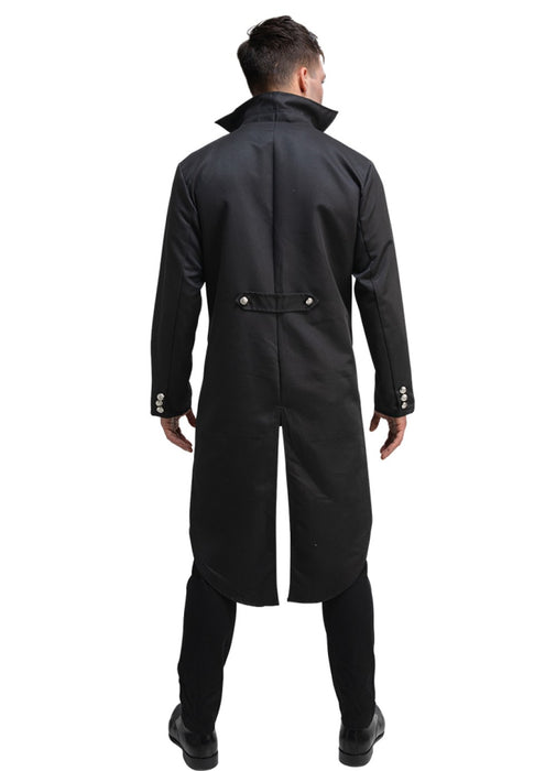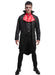 Halloween gothic vampire costume with black tailcoat, waistcoat and red cravat with jewel.
