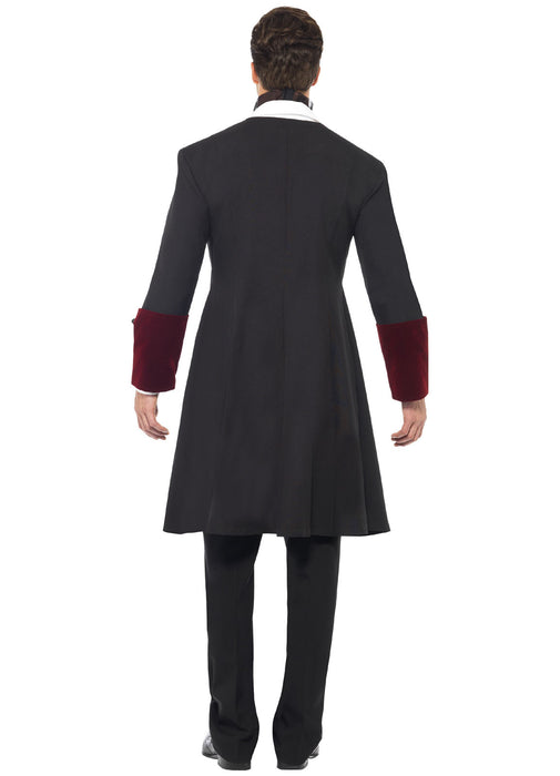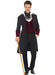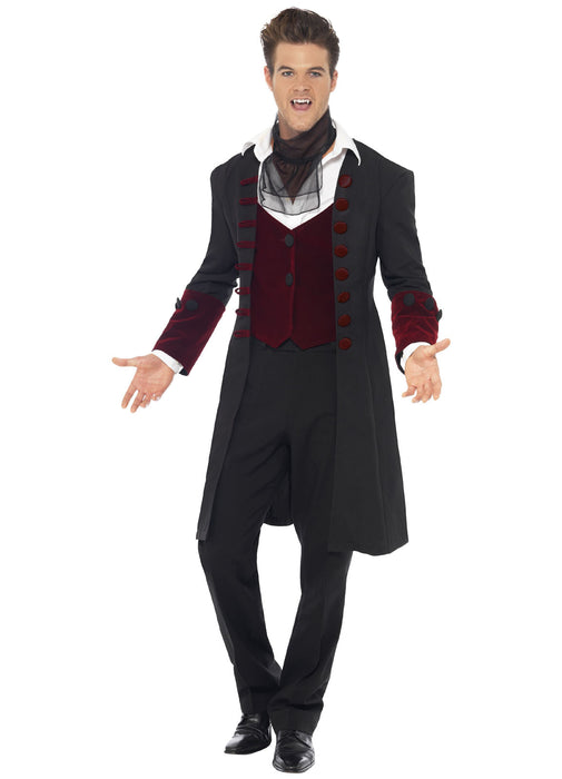 Look stylish this Halloween with the Gothic Vampire costume consisting of long black jacket with red velvet effect mock waistcoat and cuffs. Also included is the black netted cravat.