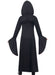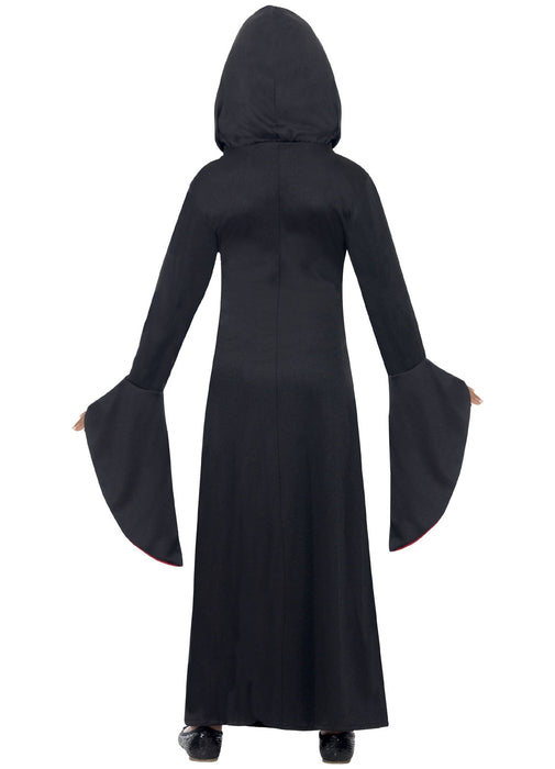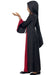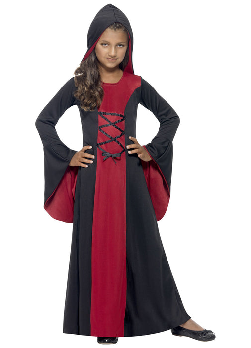 Hooded vamp robe consisting of black and red robe with attached hood, draped sleeves & front cross lace section.