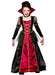 Deluxe girl's Vampire Halloween costume with long red and black dress finished with gold trim and lace along with hooped petticoat and stand up collar.