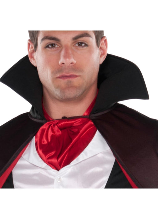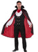 Vampire Halloween costume with knee length black cape with collar finished with red lining, white long sleeved shirt with attached waistcoat and red scarf.