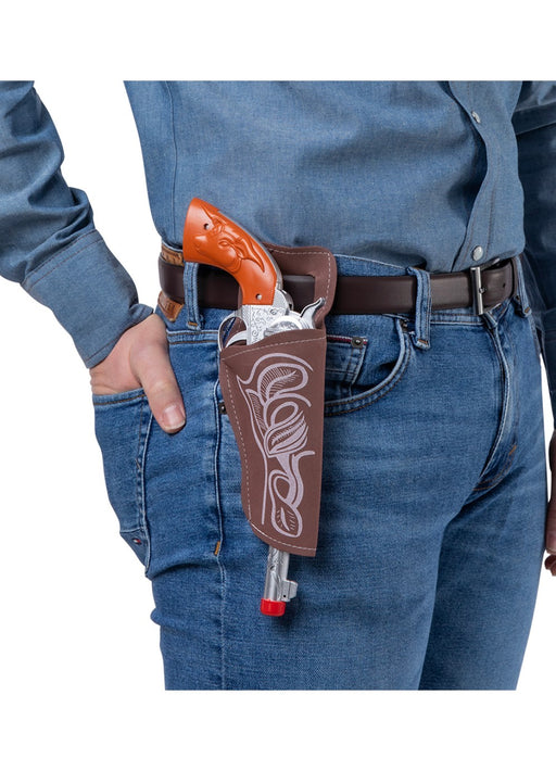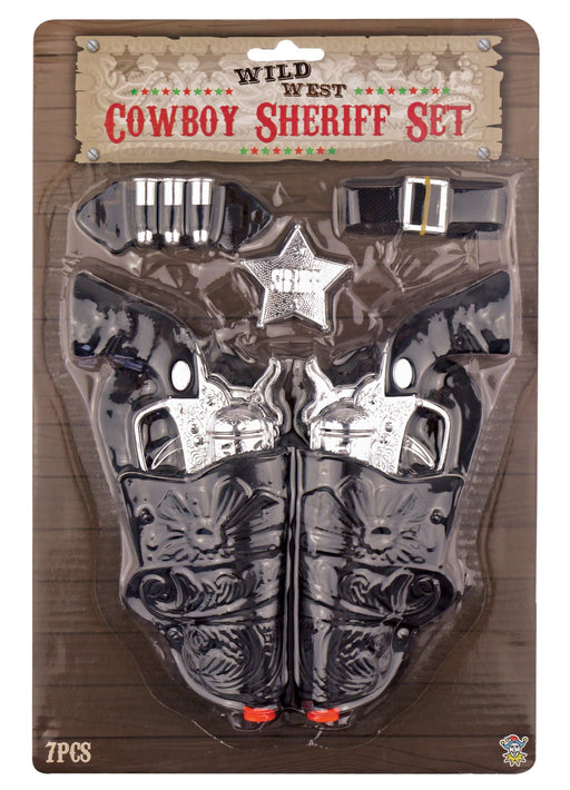 7 piece cowboy fancy dress accessory pack which includes two 18 cm guns with holsters, bullets, belt and a Sheriff's badge.