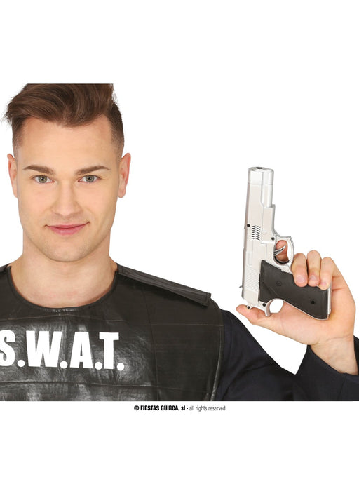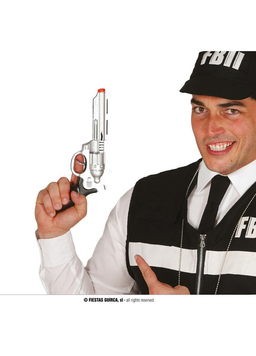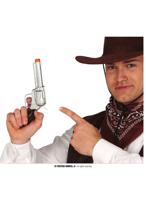 Plastic fancy dress accessory wild west style silver pistol measuring approx. 24 cm.