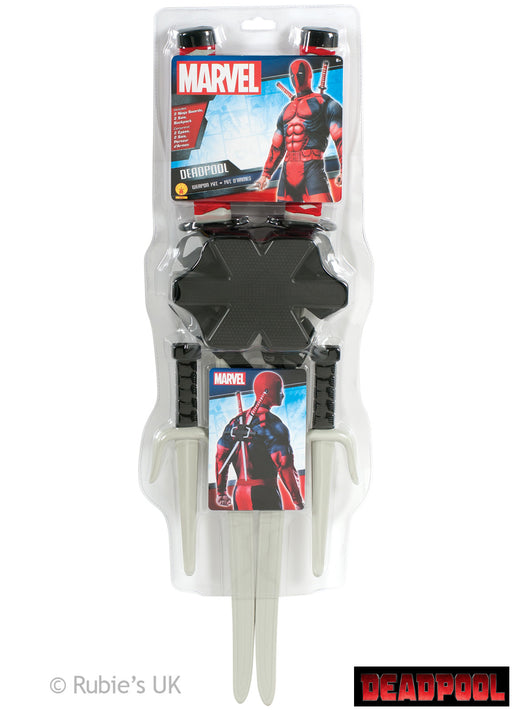 Official licensed Deadpool weapon kit consisting of 2 plastic ninja swords, 2 mini daggers & black holder backpack.