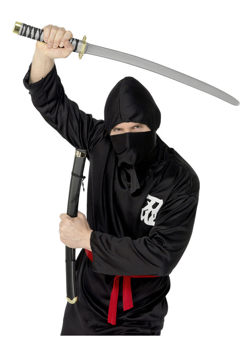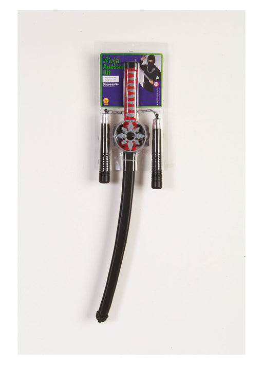 Ninja accessory kit consisting of plastic samurai sword, 2 mini daggers, circular star blade & Ninja hood.