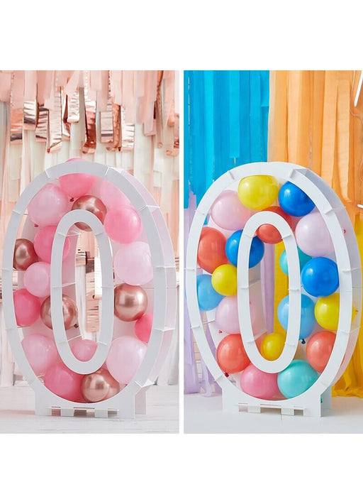 White number 0 balloon frame at 85 cm tall and 25 cm wide. Comes with easy how to assembly instructions. You will need 5 inch balloons for this pro...