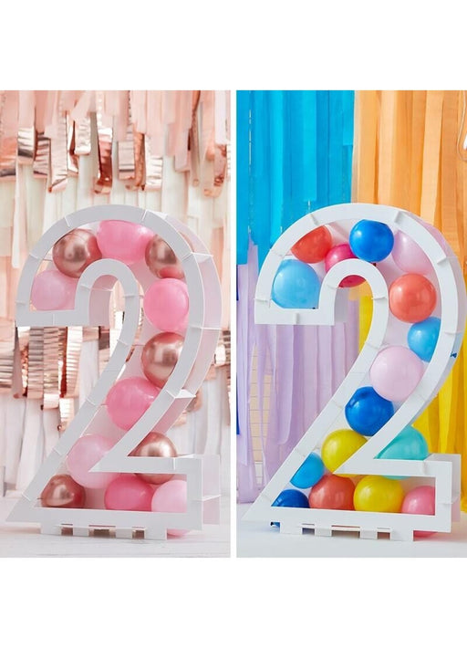 White number 2 balloon frame at 85 cm tall and 25 cm wide. Comes with easy how to assembly instructions. You will need 5 inch balloons for this pro...