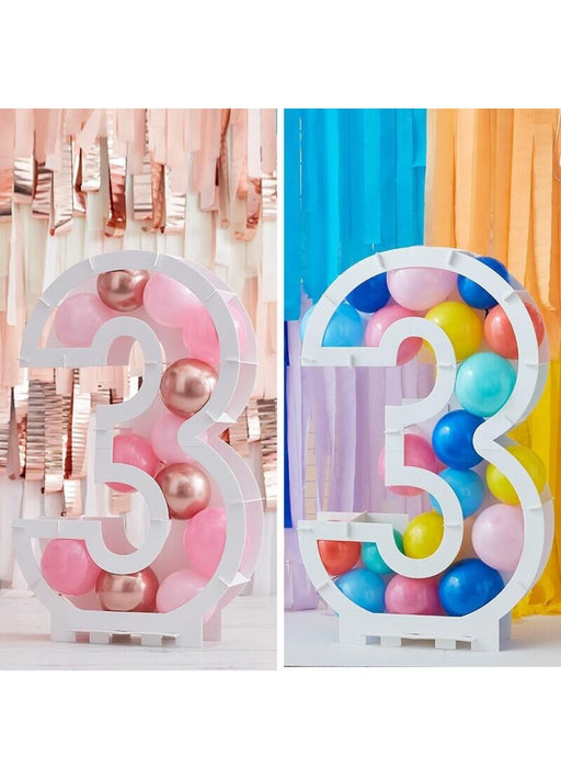 White number 3 balloon frame at 85 cm tall and 25 cm wide. Comes with easy how to assembly instructions. You will need 5 inch balloons for this pro...