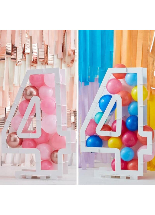White number 4 balloon frame at 85 cm tall and 25 cm wide. Comes with easy how to assembly instructions. You will need 5 inch balloons for this pro...