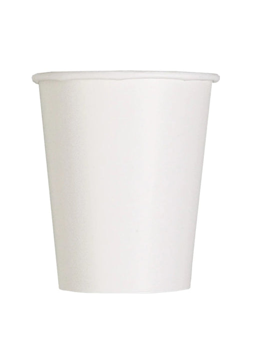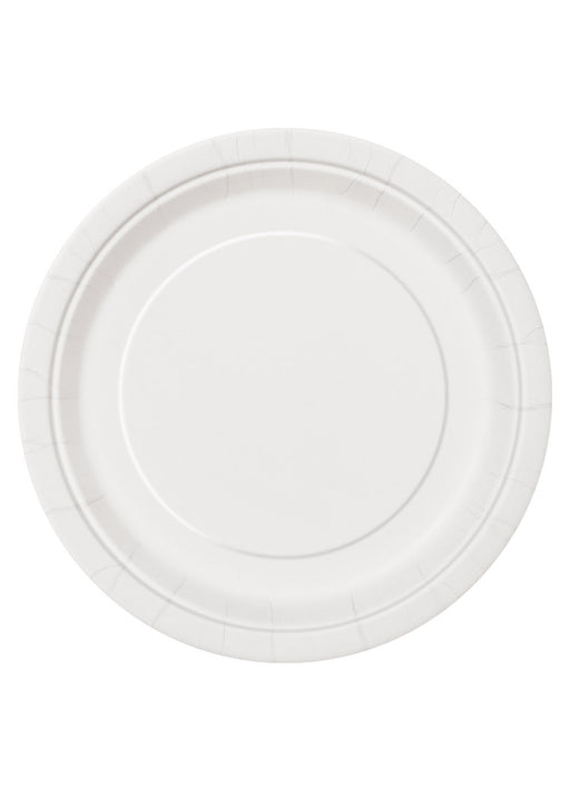 Pack of 16 bright white round paper party plates. 23cm / 9" diameter.