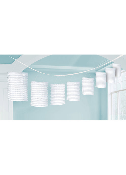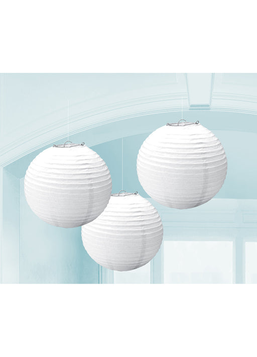 Pack of 3 white hanging paper lanterns on string measuring 9.5" or 24cm in length.