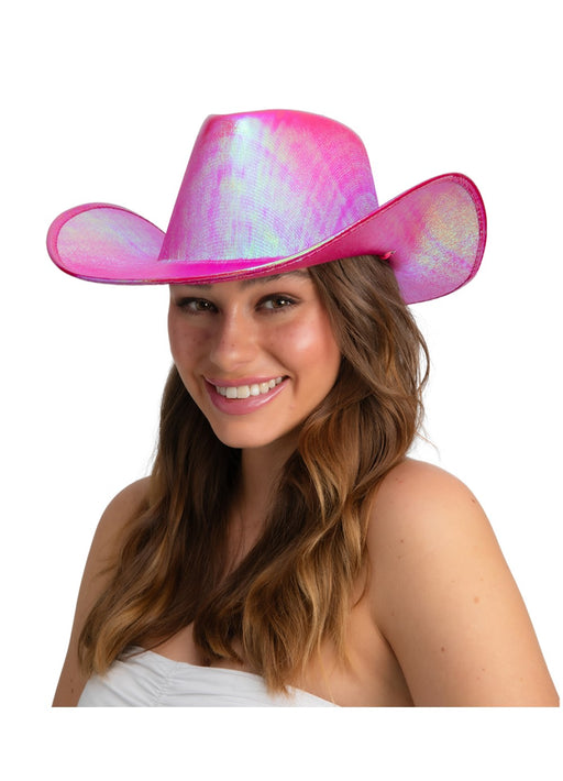 One sized shimmer pink iridescent cowboy hat with matching lace tie.