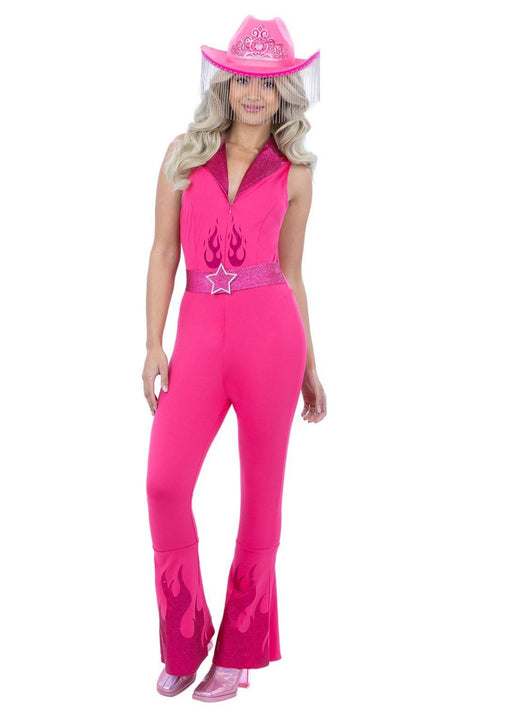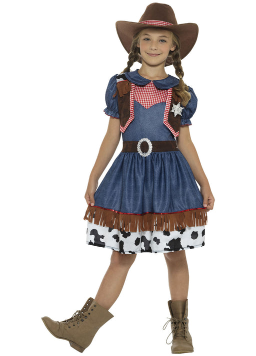 Texan Cowgirl fancy dress costume consisting of blue denim look dress with attached waistcoat and cow print trim & matching cowboy hat with che...