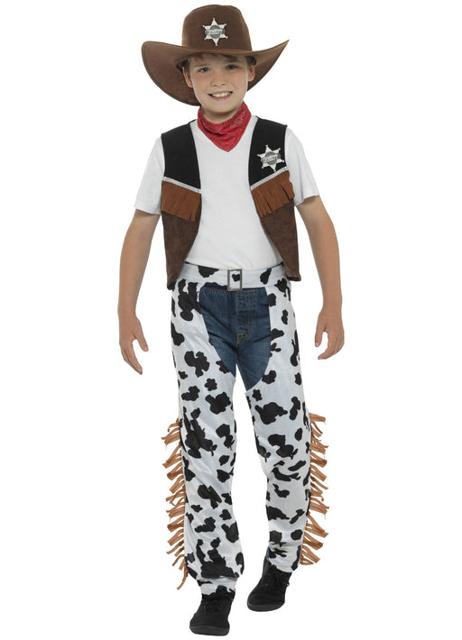 Texan Cowboy fancy dress costume consisting of waistcoat with tassels, cow print chaps, plastic star badge, red neck scarf & brown cowboy hat. ...