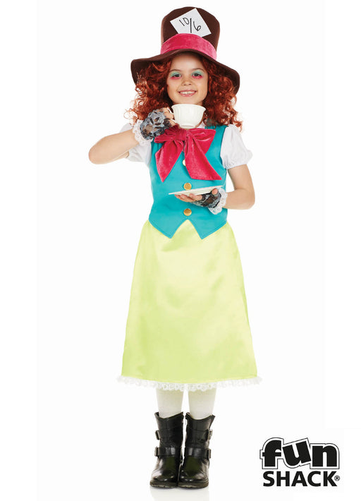 Child's Little Miss Hatter fancy dress costume consisting of lime green dress with with top and attached blue waistcoat, fingerless gloves & br...