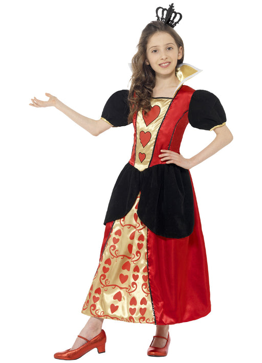 Queen of Hearts fancy dress costume consisting of long red dress with gold collar and panel, red printed hearts design & black puffed shoulder ...