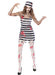 Woman's zombie Halloween convict costume with bloody black and striped dress with prisoner number and matching hat.
