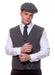 Traditional style 20's gangster man costume with buttoned waistcoat with silver chain and cap. Model is wearing own shirt and tie.