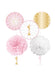 5-piece 1st birthday pink, gold and white decoration kit with 2 x fluffy decorations with hanging number 1's and 3 x different designed paper fans.