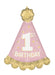 1st birthday girl large party hat design foil balloon measuring 86 cm x 63 cm.