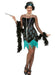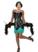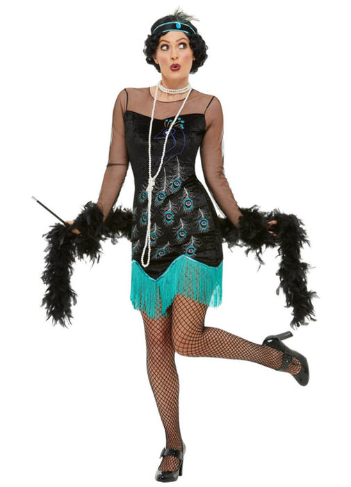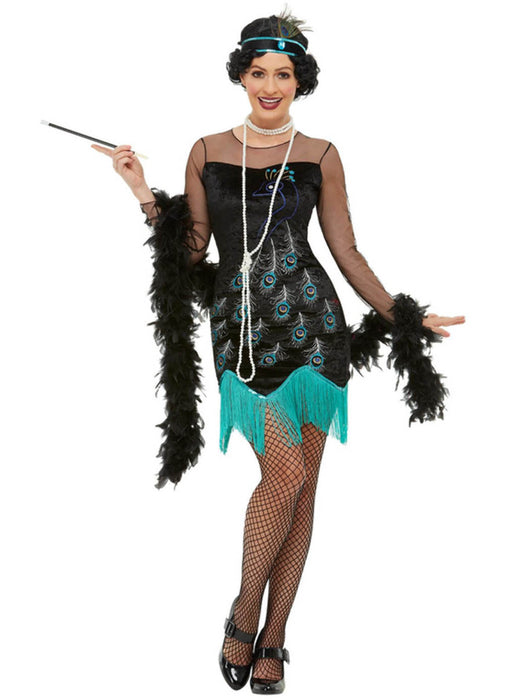 We love this addition to our 1920's flapper dress range! This costume comes with black and green peacock design dress with netted shoulder and arms effect with sequin and tasseled base. Also comes with jewelled headband.