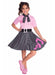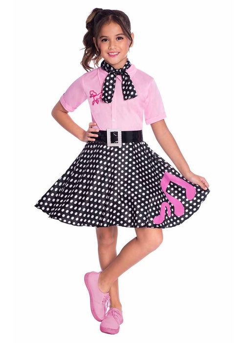 1950's pink , black and white polka dot dress with music note and poodle design along with belt and neckerchief.