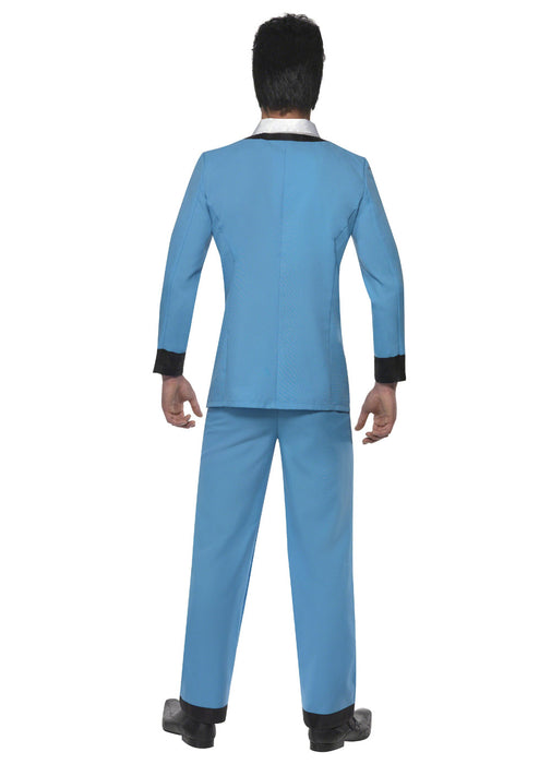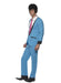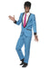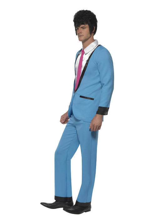 Get all shook up in this 1950's Teddy Boy style outfit which includes blue button jacket which has padded shoulders and is finished with black trim, white shirt front and pink tie along with a pair of elasticated waist trousers.