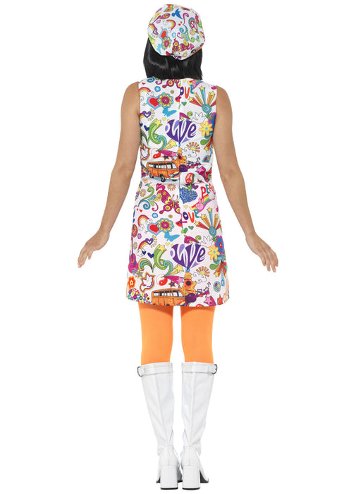 60's Groovy Chick fancy dress costume consisting of colourful themed print dress & matching hat.